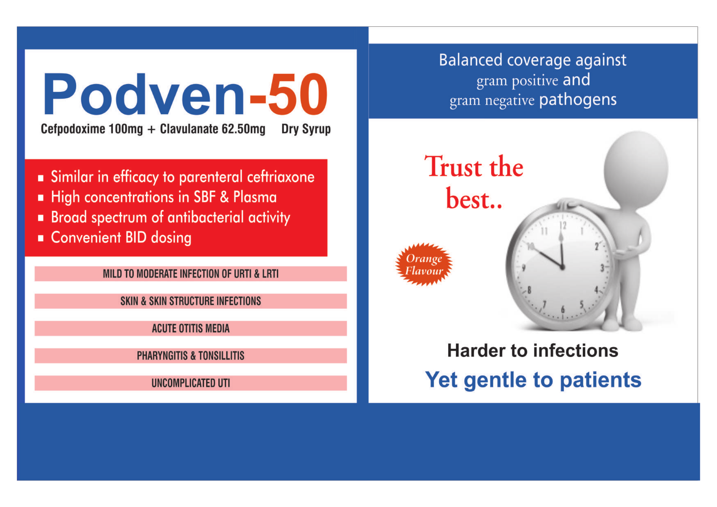 PODVEN 50mg Dry Syrup is an antibiotic medicine. It is commonly given to children for the treatment of a wide range of bacterial infections targeting the ears, eyes, nose, throat, lungs, skin, gastrointestinal tract, and urinary tract. It is also effective in treating typhoid fever in children and adolescents.