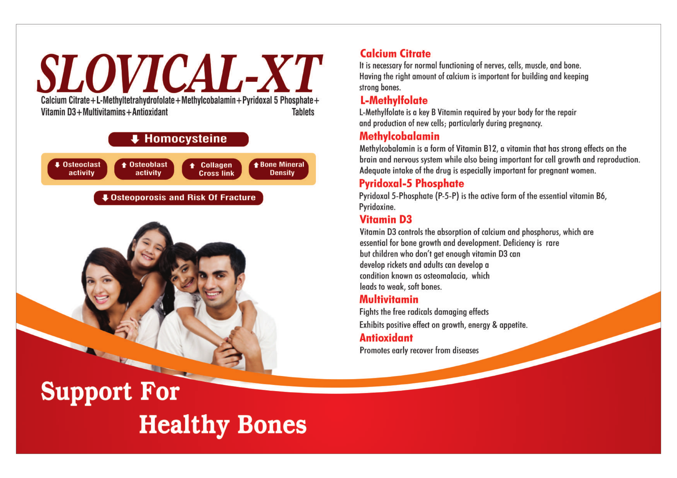 Slovical-XT Tablets provide complete bone health support with Calcium Citrate, L-Methylfolate, Methylcobalamin, Pyridoxal-5 Phosphate (B6), Vitamin D3, Multivitamins & Antioxidants. The formula helps improve bone density, reduces fracture risk, supports nerve and muscle health, and promotes healthy growth and recovery.