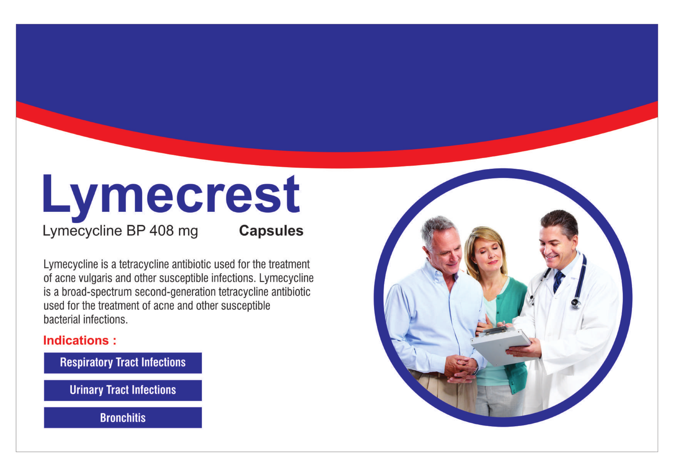 Lymecrest Capsules (Lymecycline BP 408 mg) is a broad-spectrum antibiotic used to treat acne vulgaris, respiratory tract infections, bronchitis, and urinary tract infections caused by susceptible bacteria.Lymecrest contains Lymecycline 408 mg, a second-generation tetracycline antibiotic. It effectively fights bacterial infections by stopping bacterial growth and inflammation at the source.