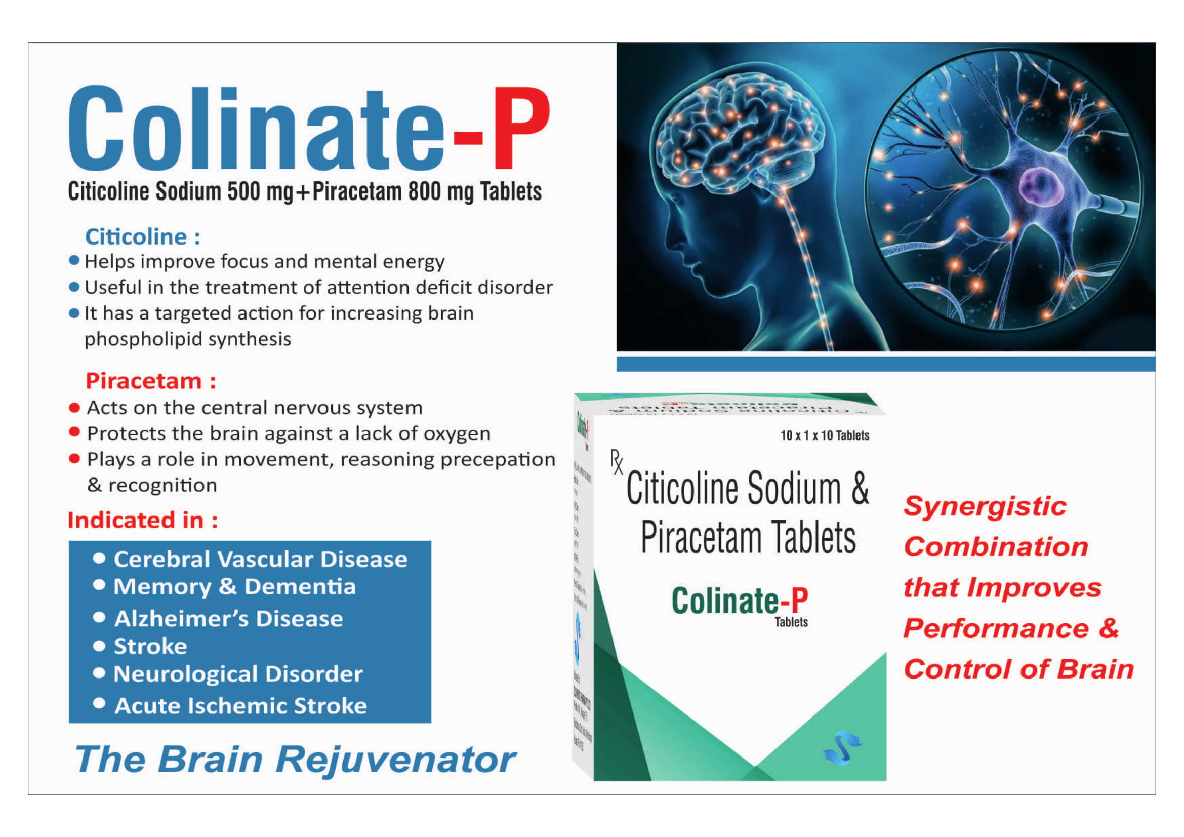 Colinate-P Tablets contain Citicoline Sodium (500 mg) and Piracetam (800 mg), a synergistic combination that supports brain function, enhances memory, improves cognition, and aids recovery from stroke and neurological disorders.